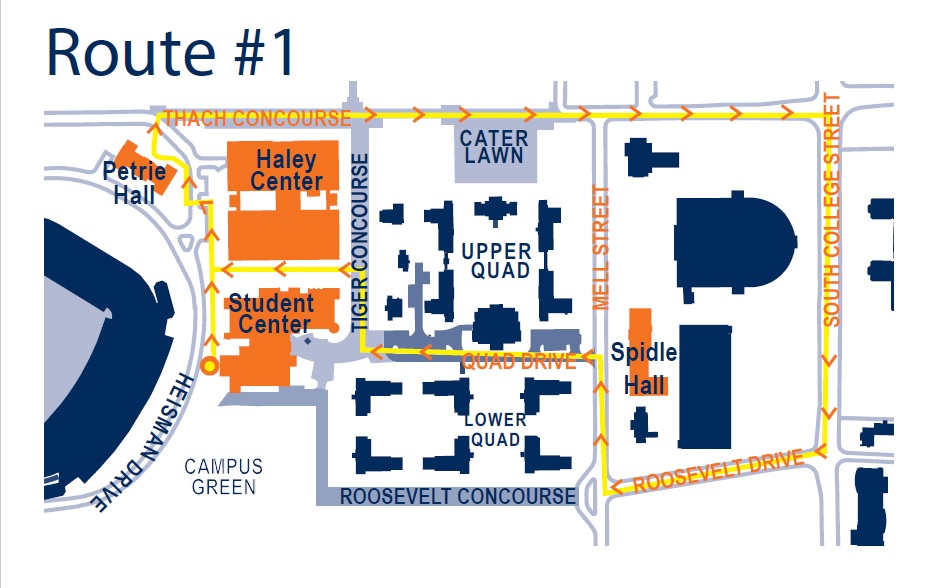 This 1-mile route begins at the back of the Student Center by the Tiger Transit hub and goes north down Duncan Drive, past the Haley Center.